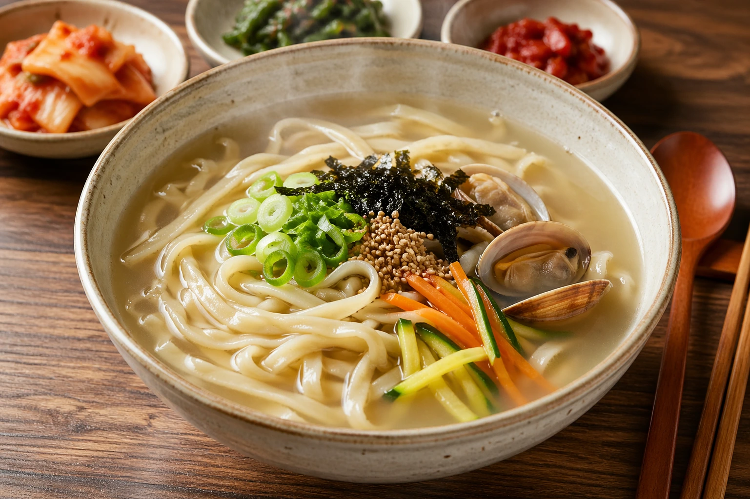 Kalguksu adalah mie kuah khas Korea dengan mie pipih buatan tangan. Kuahnya biasanya berasal dari kaldu ikan atau ayam yang rasanya lembut dan comforting. Disajikan dengan topping sederhana seperti sayuran dan daging.