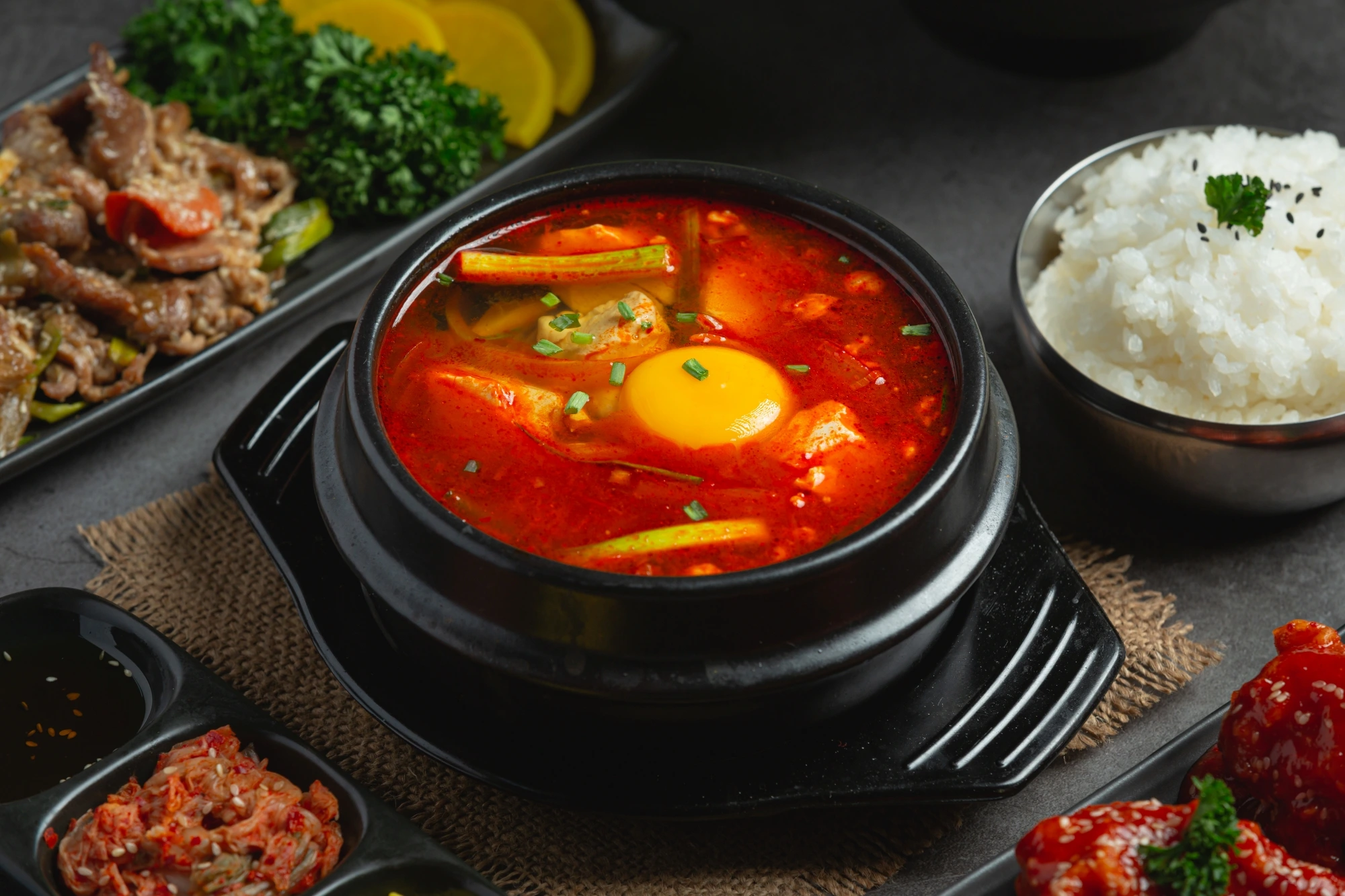 Kalau kamu suka makanan berkuah yang lembut tapi tetap berbumbu, sundubu jjigae bisa jadi pilihan. Sup ini menggunakan tahu sutra yang teksturnya halus, dimasak dengan kuah pedas dan gurih. Biasanya ditambahkan seafood, telur, atau daging.