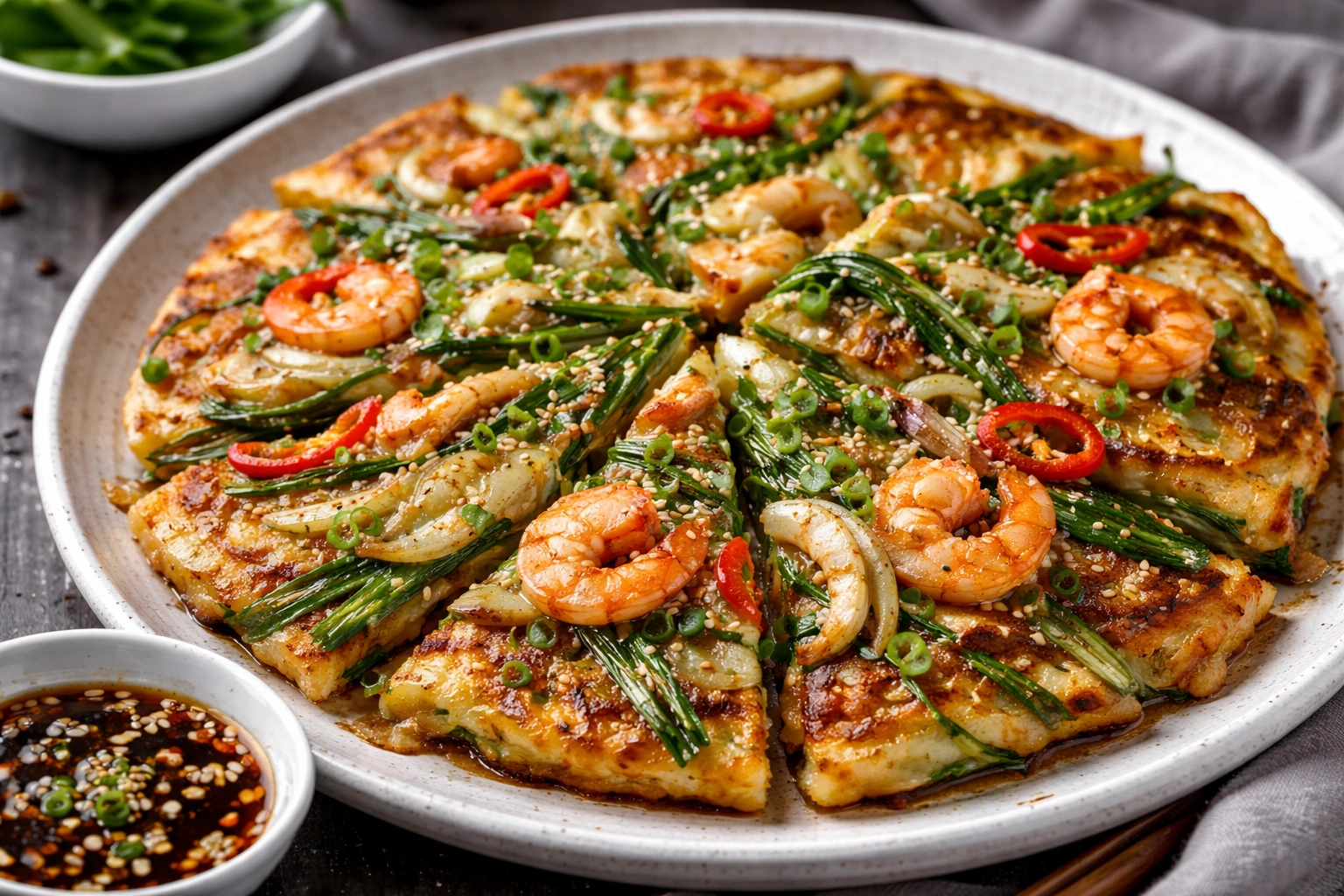 Pajeon adalah pancake gurih dengan isian daun bawang dan bahan lain seperti seafood atau sayuran. Adonannya simpel, hanya tepung, air, dan telur. Digoreng sampai garing di luar tapi lembut di dalam.