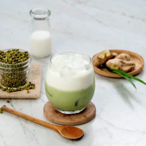 Beri es batu, tuang sari kacang hijau dalam gelas saji hingga 1/2 bagian gelas, kemudian tuangi larutan FiberCreme 1/4 bagian gelas.