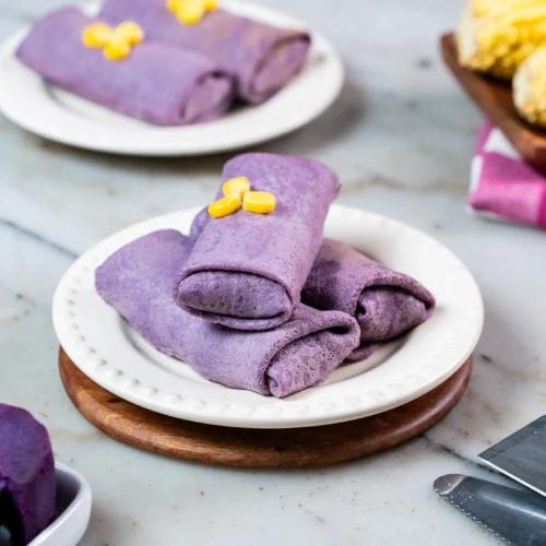 Kulit dadar gulung: haluskan ubi ungu dengan air. Tuang semua bahan ke dalam bowl kecuali mentega leleh, aduk rata. Tambahkan mentega leleh dan aduk lagi.