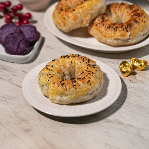 • Siapkan puff pastry, lalu tuang ubi ungu secara merata. Tambahkan keju mozzarella dan gulung membentuk donat.