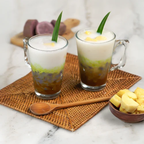 Penyajian : siapkan gelas saji, masukkan sirup gula merah, ubi cendol ungu, tape ketan hijau, es batu, lalu tuangi larutan kuah, kemudian beri tape singkong sesuai selera. Siap disajikan selagi dingin.