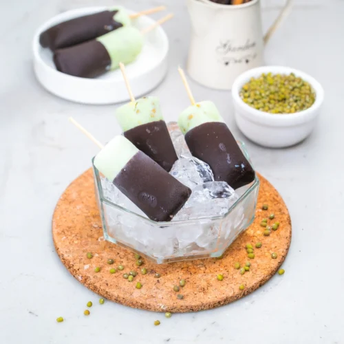Penyajian : Celupkan es kacang hijau yang sudah beku ke dalam saus, angkat dan tiriskan, biarkan hingga saus membeku.