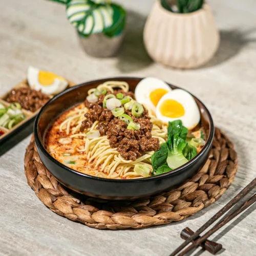 - Tambahkan mie telur, daging bumbu mala, pakcoy, dan telur rebus.