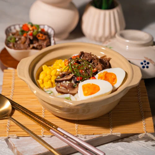 Sajikan udon dengan kuah creamy dan tambahakan topping beef bulgogi, telur, jagung, dan tambahan garnish lainnya.