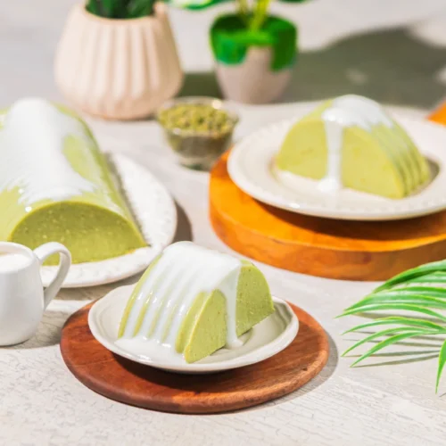 - Haluskan kacang hijau dan tambahkan air, agar agar, pasta pandan, garam, dan FiberCreme. Masak sampai mendidih dan tuang dalam cetakan.