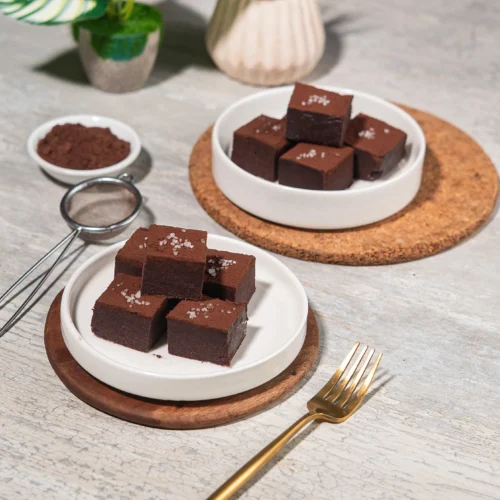 • Keluarkan dari loyang, potonng-potong, kemudian taburi seluruh permukaan dengan cocoa powder dan berikan taburan sea salt sebagai garnish.