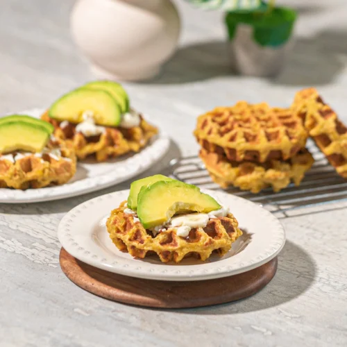 • Spread cream cheese diatas waffle, tambahkan alpukat dan madu.